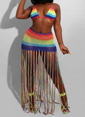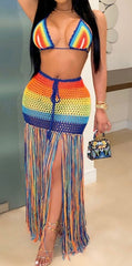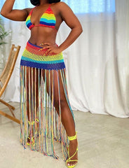 Elevate your summer style to new heights with our Radiate Joy Rainbow Crochet Tassel Skirt Set. Made with vibrant rainbow crochet and playful tassels, this set will have you shining and spreading joy wherever you go. Perfect for a fun and colorful look, guaranteed to brighten your day.